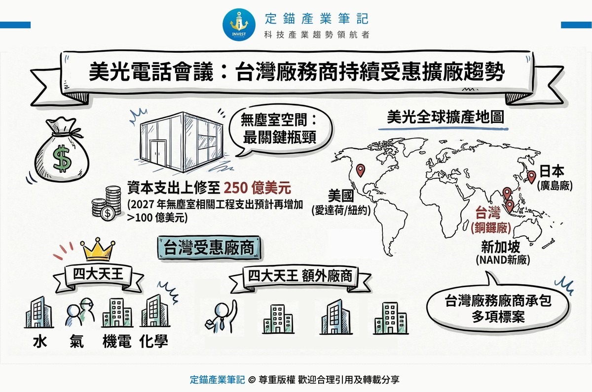 Micron不僅將2026年資本支出從200億美元上修至250億美元,並表示當中多數將投入無塵室擴充,且2027年投資於無塵室基礎建設的相關支出會再增加100億美元。