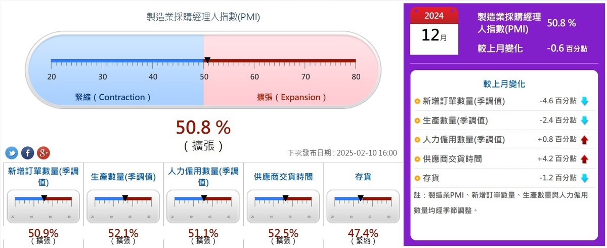台灣2024年11月外銷訂單522.7億美元,MoM -5.7%、YoY +3.3%,低於前一個月YoY +4.9%,低於預期區間4.7%~8.6%,儘管AI伺服器需求維持強勁,但智慧型手機訂單動能疲弱,導致資通訊產品年增率轉為負值,加上基本金屬、化學品......等傳統產業仍面臨中國產能供過於求的壓力,使得外銷訂單成長放緩。經濟部表示,受惠於半導體先進製程與AI伺服器需求支撐,以及廠商趕在2025年1月底農曆春節前囤貨,預估12月外銷訂單區間495~515億美元,YoY +13.0~17.5%。