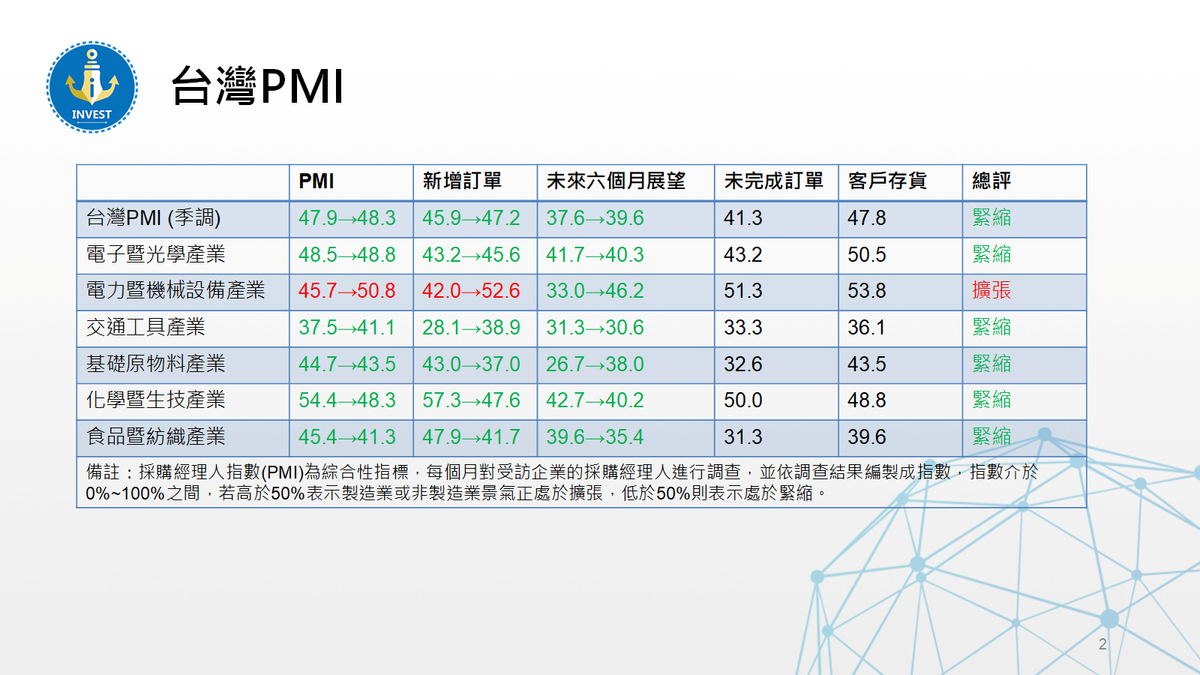 台灣2025年9月製造業採購經理人指數(PMI)連續3個月緊縮,主因美國對等關稅正式生效,加上《232條款》半導體關稅實施細節未明,台灣貿易談判團隊仍持續與美方磋商,市場仍存在許多不定確性,導致製造業普遍處於觀望態勢,「生產數量」、「新增訂單數量」皆持續緊縮,多數業者對未來六個月展望仍趨保守。