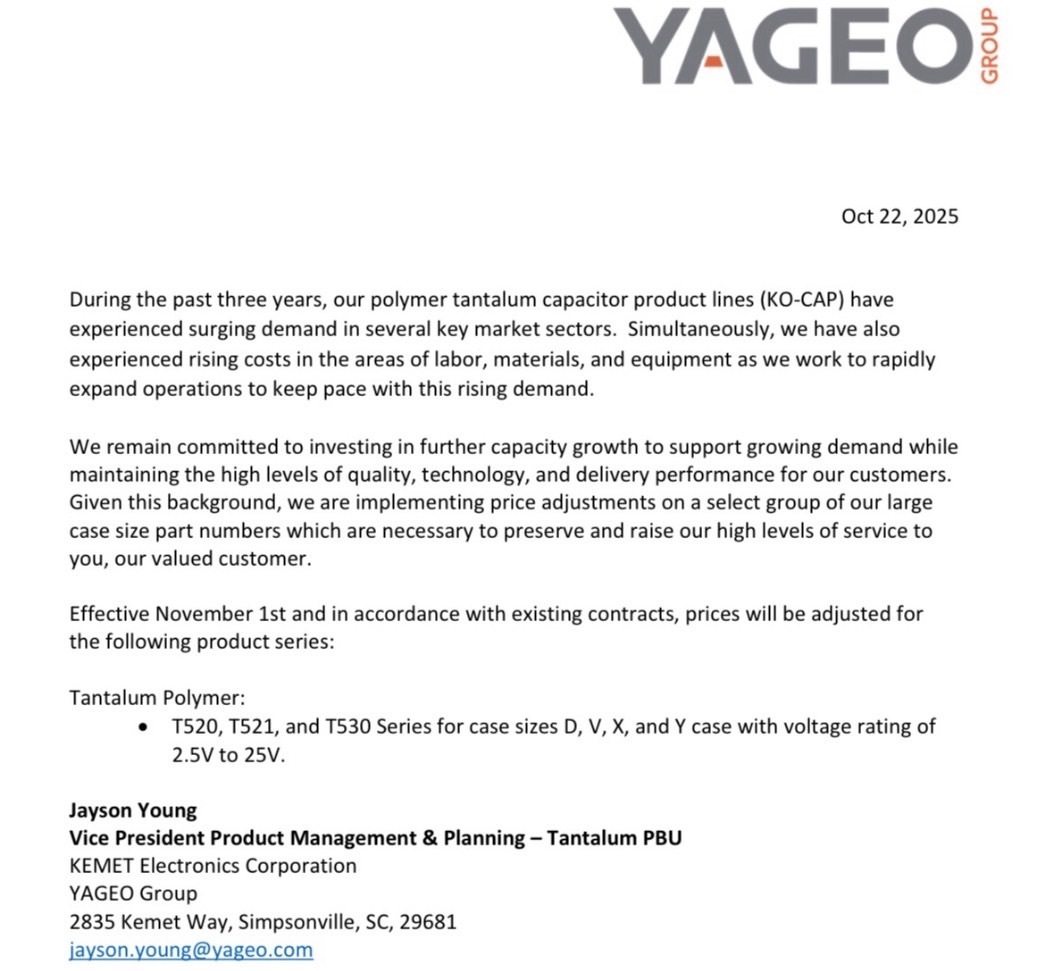 在「台股觀察週報 2025/10/12」,定錨研究團隊已領先提到,國巨與客戶協商調漲鉭質電容、MLCC報價,最終鉭質電容成功調漲約3~7%,但MLCC未獲得客戶接受。