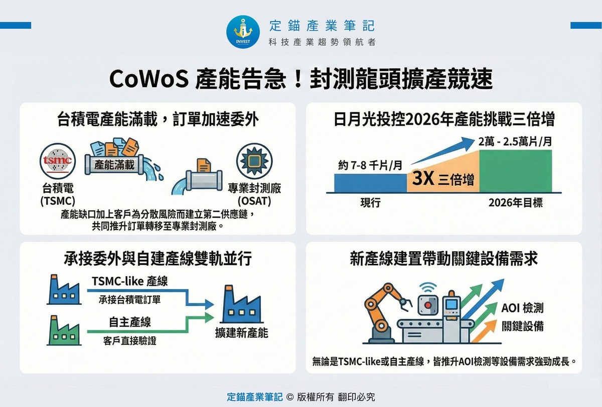 上週定錨研究團隊發佈獨家產業報告,指出2026年專業封測代工廠將會遵循「TSMC-like」或「自主產線」模式,大幅擴充CoWoS先進封裝產能,引發市場熱烈討論。