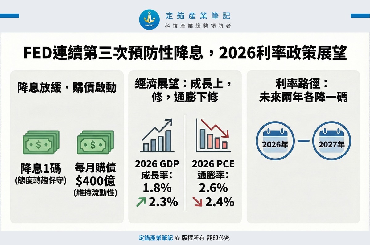 此外,FED上修2026、2027年經濟成長率,下修2026、2027年通膨年增率,顯示FED認為,預防性降息足以緩和勞動市場下行風險,美國關稅政策帶動通膨升溫也將2026下半年逐步淡化。