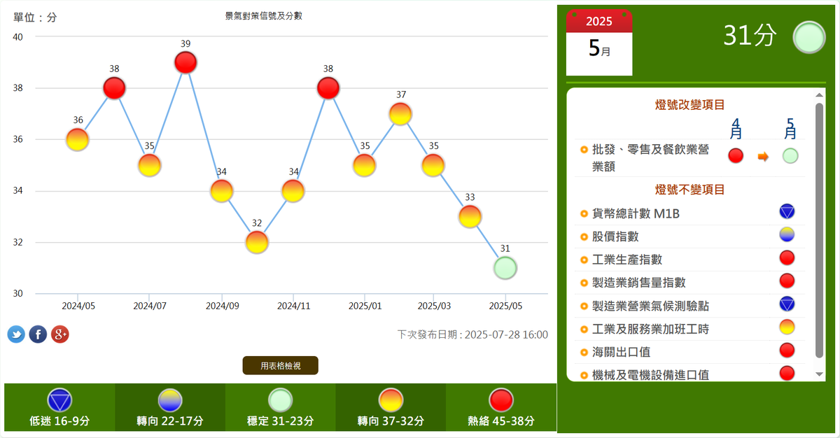 最新公佈的2025年5月景氣燈號正式降至綠燈,終結自2024年4月以來連續呈現黃紅燈或紅燈的景氣榮景,顯示雖然國內景氣仍維持成長態勢,但擴張力道已逐步放緩,須密切關注後續發展,以掌握景氣是否存在進一步轉弱的風險。